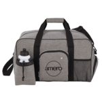 The Weekender 18.5" Deluxe Duffel Bag features a zippered main compartment, zippered front media pocket with earbud port and a front mesh pocket and front pouch with an adjustable drawstring and squeeze-top water bottle (not imprinted). It also includes a zippered side shoe compartment and a secure bottom board for stability. The double 20.5 inch reinforced handles and detachable, adjustable shoulder strap make carrying simple and convenient.