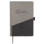 Heathered PU hard cover bound journal with front pocket for holding a smartphone, business cards or documents. Elastic pen loop, back document pocket and ribbon page marker. 80 sheets of cream lined paper.
