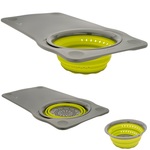 Cutting board measures 21” x 12” with built-in 2-quart colander that collapses down for convenient space saving storage