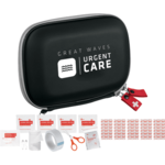 Stay safe with this 16-piece quick fix first aid kit. Set includes four alcohol prep pads, non woven sponge, five adhesive bandages, surgical tape, conforming bandage, triangular bandage, scissors and two safety pins, all packed inside of durable zippered EVA case. Meets FDA requirements. Available in Canada.