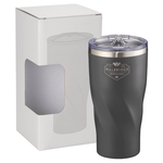 Do not miss the most trendy tumbler of the year. Durable, powder coating, double-wall stainless steel vacuum construction with copper insulation, which allows your beverage to stay cold for 24 hours and at least 8 hours for hot beverages. The construction also prevents condensation on the outside of the tumbler. Push-on two piece lid with Tritan™ swivel closure, pinch the 2 axis joints slightly to remove the top part of the lid for easy cleaning. Wide opening for comfortable filling and pouring. Design features the spinning, geometric bottom. Leed's Exclusive. 20oz. Laser engraving silver Drinkware will result in a subtle, tone on tone decoration