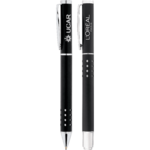 Unique brass barrel cutouts reveal high shine chrome accents. Pens include premium black ink cartridges.