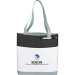 Part of the Split Decision Trend Collection. Fresh budget tote style for tradeshows, conventions, and business meetings features refreshing hues and the popular color dip trend. Open main compartment. Pen loop. 12" handle drop height.