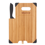 This innovative natural bamboo cutting board includes a built in carving knife with stainless steel blade and soft touch handle. The cutting board features silicone corner accents to prevent the board from slipping as well as a swivel stand to display the board upright. Cutting board measures 13.39" x 9.21". Due to the nature of the bamboo material, variations in color and imprint may occur.
