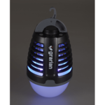 Keep the pesky bugs away with the Mosquito Repellent Night Lamp. The lamp features a bottom light, a bug zapping light, and a hanging hook. The both lights are activated by touch on the top of the lamp. The bottom bulb is a bright LED light comparable to a filament bulb. The blue light in the center surrounded by a safe guard has a special wavelength that attracts insects to the inner grid that shocks them with 2000V of electricity. They then fall to the inner space of the lamp there they can be swept away with the included brush. Perfect for all outdoor areas, the Mosquito Repellant Night Lamp is rechargeable by USB. One 18650 lithium battery included.