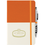 The 5" x 8" Two Tone Bound Notebook features a textured PU paired with a smooth PU. Bound notebook with 80 sheets of cream lined paper with color matching painted edges. Color matching ribbon page marker, pen loop and elastic closure.