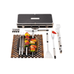 This 13-piece BBQ set includes everything needed to be king or queen of the backyard grill - spatula, tongs, knife, fork, four skewers, and four corn holders, all in an aluminum accented case. Handles are plastic with stainless steel grip to prevent heat transfer. For the skewers this allows you to hold the handles and have full control basting food and perfecting the amount of charring you want. Do not expose the handles to direct heat or use in broiler.