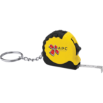 The Pocket Pro Mini Tape Measure Keychain includes a 39-inch retractable, locking tape measure with standard and metric measurements. A slide-locking button locks the tape in place. It features a rubber grip and a metal split-ring keychain.