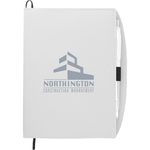 The 6" x 7.5" Talbot Notebook is an 80-ruled page, paperback bound notebook with a UltraHyde sleeve cover. It includes a ribbon bookmark and a matching color ballpoint pen with an elastic pen loop. A pen imprints not available.